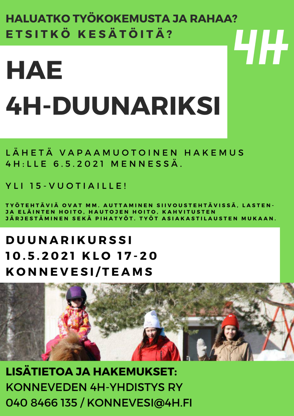 Töihin Konneveden 4H:n duunaripalveluun? Duunarikurssilla opit perustaitoja esim. asiakaspalvelusta ja duunarille tyypillisistä työtehtävistä. Kurssin käymisen jälkeen pääset mukaan 4H:n duunaririnkiin, jonka avulla voit työllistää itsesi, vaikka kesällä! Ilmoittaudu mukaan 5.5. mennessä joko kotisivujemme nettilomakkeella tai laittamalla viestiä 4H-Tiinalle puh. 040 846 6135.