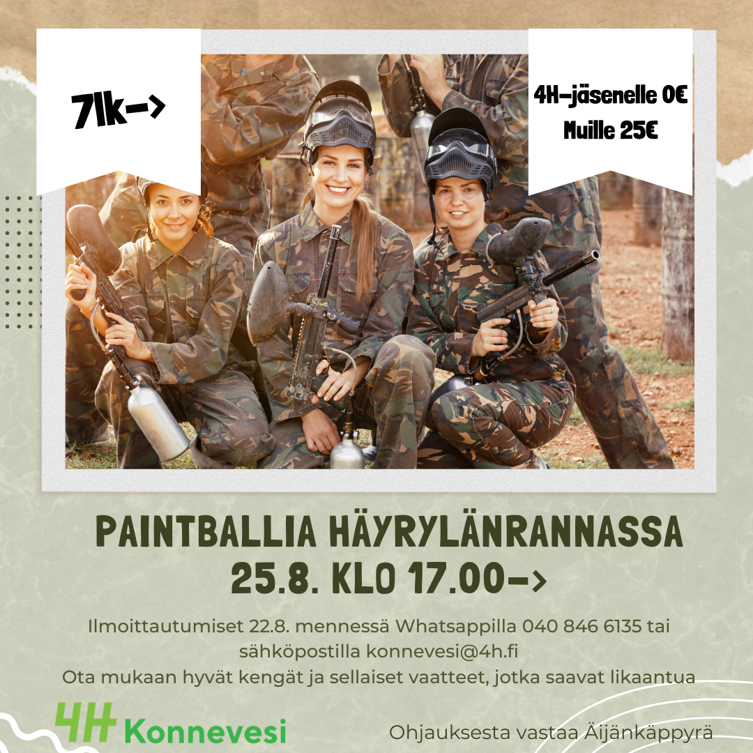 Pelit on 4H:n jäsenelle ilmaiset ja muille sitten 25€. Ota mukaasi hyvät kengät ja sellaiset vaatteet, jotka saavat likaantua (ja ovat hiukan paksummat, jotta osumat ovat hiukan pehmeämpiä). Ilta on tarkoitettu yläkoululaisille ja sitä vanhemmille.